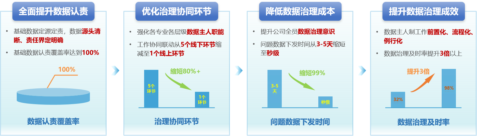 高效便捷的数据主人工作台通过构建数据主人制管理体系和工具产品,有效夯实数据主人制底座能力,形成横向协同、纵向贯通、源头治理的常态机制,推动“要我治理”向“我要治理”转变,引导数据主人积极履行职责,增强数据主人的责任感和获得感,极大提升了数据治理的主动性和高效运营。